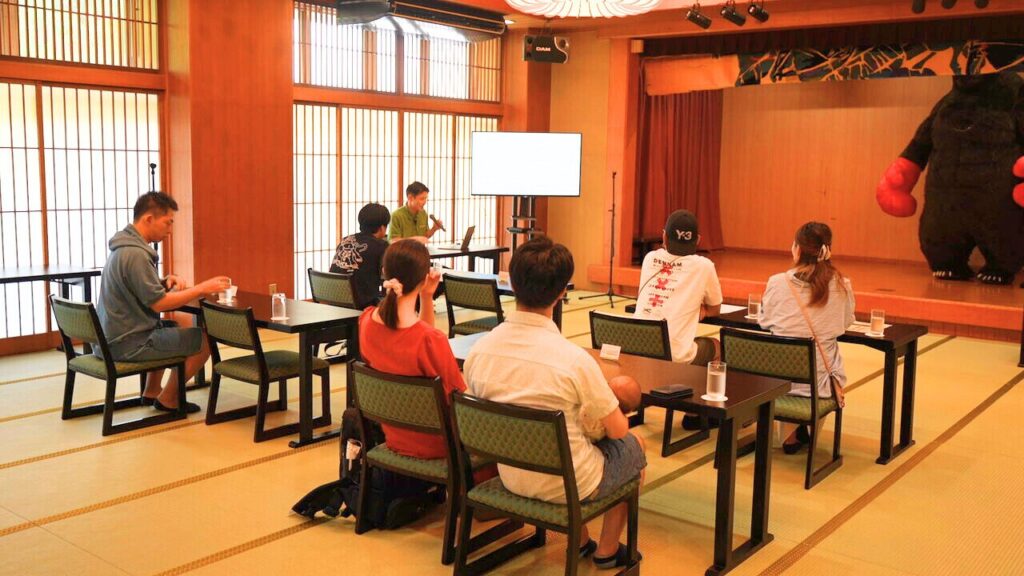 普通のホテルとは違い、チェックイン後に早速開会式!今回のファミリー経営者合宿の概要説明から行いました。初めてお会いする皆様が揃う中で、まずは場の雰囲気を盛り上げるためにMAGMA名物「マーム」の登場からスタート!